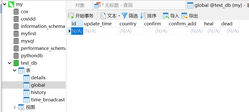 create table global( id int(11) not null auto_increment, update_time datetime default null comment '数据最后更新时间', country varchar(50) not null comment'国', confirm int(11) default null comment'累计确诊', confirm_add int(11) default null comment'新增确诊', heal int(11) default null comment'累计治愈', dead int(11) default null comment'累计死亡', primary key(id) )engine=InnoDB default charset=utf8mb4;