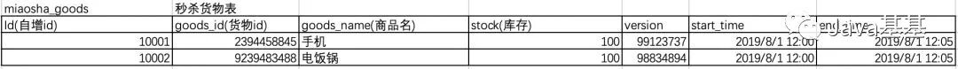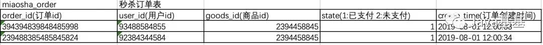 其实应该还有几张表,商品表:可以关联goods_id查到具体的商品信息,商品图像、名称、平时价格、秒杀价格等,还有用户表:根据用户user_id可以查询到用户昵称、用户手机号,收货地址等其他额外信息,这个具体就不给出实例了。
