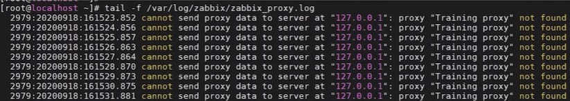 The message that proxy data cannot be sent to the server at the localhost IP address, because the proxy “Training proxy” is not found will appear only in one case — when the hostname parameter in the Zabbix proxy configuration file does not match the proxy name in the Zabbix frontend.