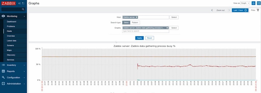 If we check the server log, there might be nothing wrong in it — no problems, no slow queries. We can also go Monitoring > Hosts and display, for instance, the ‘internal process busy‘ graph.