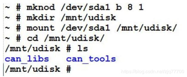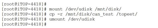 然后使用命令“mount /dev/udisk /mnt/disk/”将 u 盘挂载到开发板上,使用命令“cp -r /mnt/disk/can_test /topeet/”将可执行文件拷贝到“/topeet”目录下,使用命令“umount /dev/udisk”解除挂载,如下图所示。