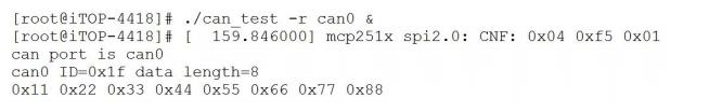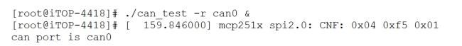 在一块开发板上,先使用命令“./can_test -r can0 &”,运行接收程序,如下图所示。
