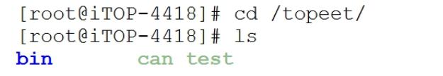 以同样的方式将可执行文件拷贝到另一个开发板上,使用命令“cd /topeet”进入“/topeet”目录下,我们可以使用命令“ls”查看到“can_test”,如下图所示。