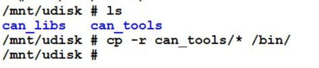 拷贝工具软件到/bin 目录下,使用命令“ cp -r can_tools/* /bin/”,如下图所示。