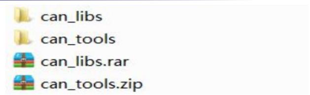 首先配置工具和库文件,将压缩包“can_libs.rar”和“can_tools.zip”解压得到“can_tools”和“can_libs”,拷贝解压出来的文件到 tf 卡或者 u 盘,如下图所示。
