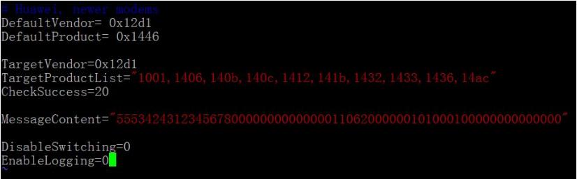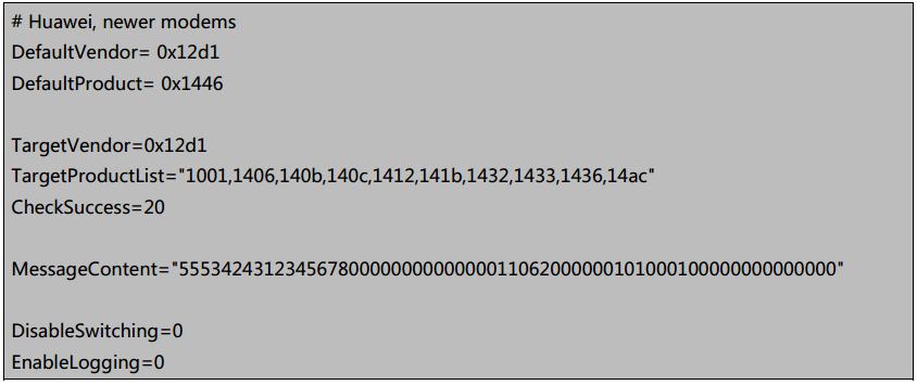 上面这段代码最重要的是 DefaultVendor= 0x12d1 和 DefaultProduct= 0x1446,它制