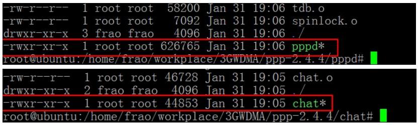 编译到此完成,可以看到在 pppd 文件夹生成了 pppd工具,在 chat 文件夹生成了 chat