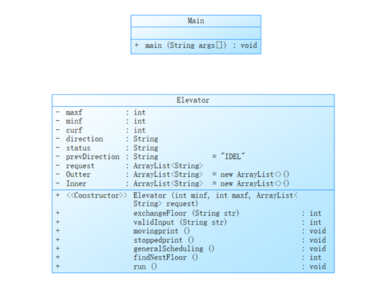 Main类是处理与操作的类,而Elevator类中则负责储存各种属性,储存内外部命令,以及给Main类提供可调用的方法。