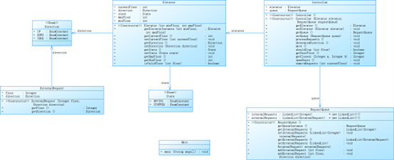 ExternalRequest类:用于处理外部请求,有floor,direction两种属性,getter方法能够反映外部请求的需求。