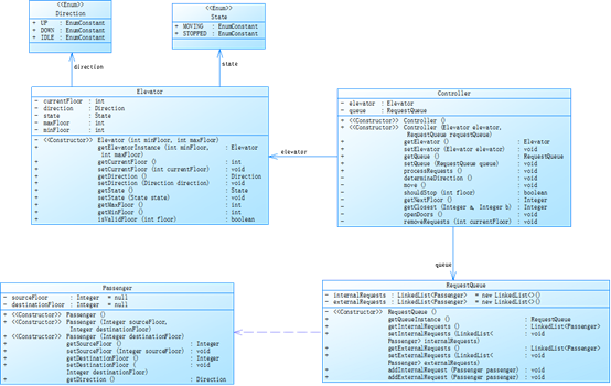 Direction类:为枚举(Enum)类,列举了电梯的三种状态(向上,向下,空闲)。