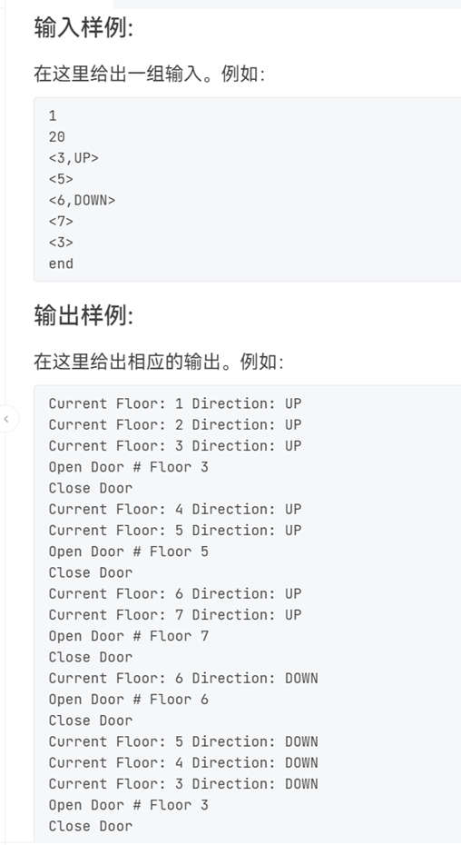 这是第一次题目中的设计样例,我没有认真看懂题目的底层逻辑,只是通过简单的一个样例,误以天真的认为这个题目就是电梯先向上,一直到内外部所有命令中最高的楼层,中途停靠在内外部命令中有的楼层,最后再处理外部命令中Diretion是DOWN的命令,做到真正的只有“一上”和“一下”(我还以为所有的命令是同时发生的,其实只有内外部各自第一个命令同时,有点滑天下之大稽了,hhh)。