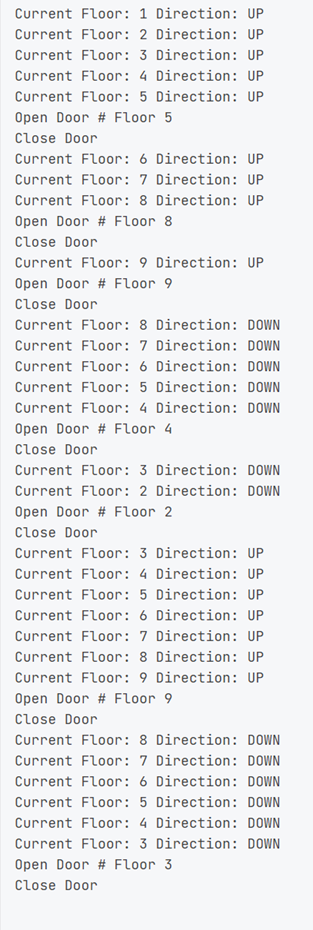 2. 这应该是很多人一开始都会忘记考虑的问题:当你下一个处理的指令是一个外部指令,而你从当前楼层去往外部指令请求楼层时,到达目的楼层时的方向可能与外部请求的方向相反,此时务必要将状态改为外部请求的状态,而不是保持原来的状态,例如,电梯以UP的状态到达目的楼层,而外部请求的方向是DOWN,不改变方向则在接下来的进程里会优先处理UP方向的指令,与题目里的逻辑不符。