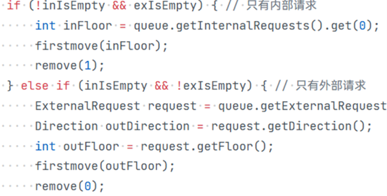 本次题目中的其他类别与第六次作业中的设计大差不差,而新增的Passenger类的作用自然是完成此次作业中的新需求:本次作业中的算法逻辑发生了一点有趣的小变化,现在的外部请求更像是两个指令:指令左侧的相当于原来题目中的一个外部请求,而右侧则是额外的一个内部请求,并且会加入内部请求的末尾。这对于我们代码对指令的处理要求就更高了,只有处理好每一个内外部代码的先后与背后逻辑,才能使得电梯正确的运行。