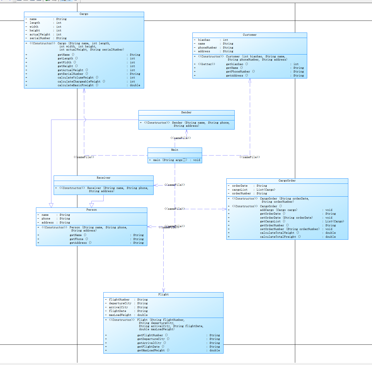 代码中基本遵顼面向对象基本原则:单一职责原则(客户、货物、航班、订单类各自独立,各自有各自的功能);里氏替换原则(子类可以正确继承父类);开闭原则(做到对扩展开发,对修改关闭);合成复用原则(对象间通过组合协作)。