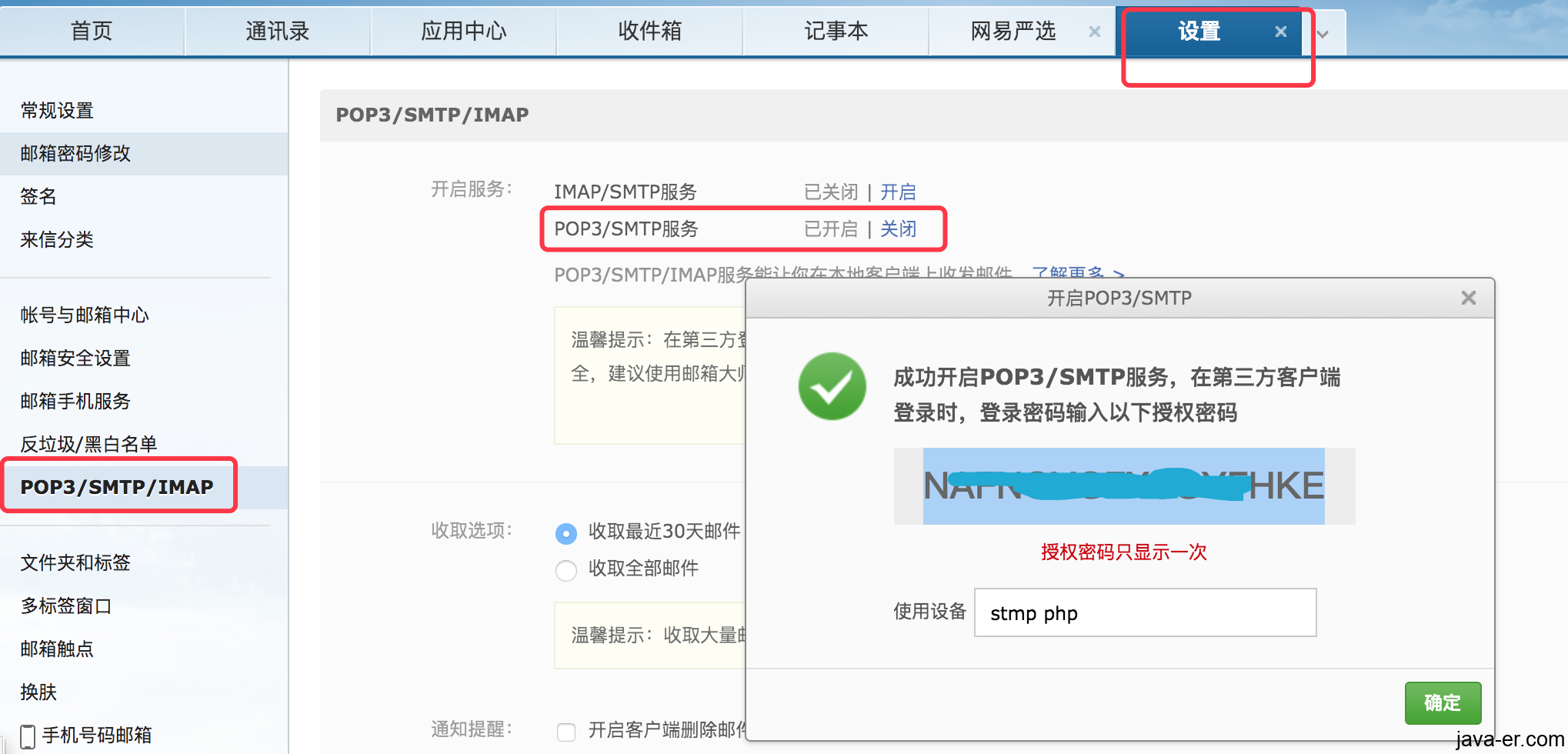 开启授权码的截图