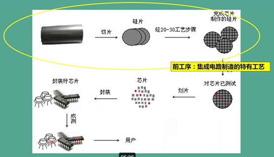 沙子→精炼硅锭→晶圆wafer制备(横向切割)→集成电路制作