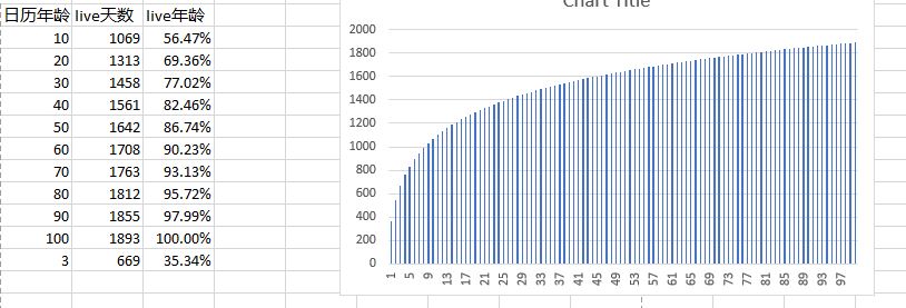 我按照1/n 的增长,把年龄做了一张表格,活到100个日历年,其实仅能记住1893个日子, 期初的3岁其实就已经是人生记忆的1/3, 这就是为什么说三岁看老的原因。其实10岁人生的体验就过了一半,孩子开始上高小和初中了,开始懂事了。 过了30岁相当3/4人生已过,60岁其实就是90岁了,30岁和60岁的人自由畅谈,因为他们人生其实是77岁和90岁的区别。10岁以前急剧上升,30岁以后越来越平缓,一年对于你来说你体会不到很多东西了,20岁以后的80年,体会都敌不过10岁前的10年。所以:劝君莫惜金缕衣,劝君惜取少年时。 年少时,你体会跟多,你的在岁月里更丰盛。