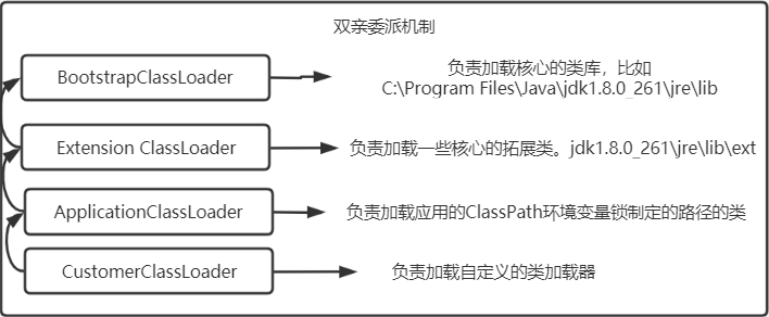 2.将这个请求向上委托给父类加载器去完成,一直向上委托,直到启动类(根)加载器