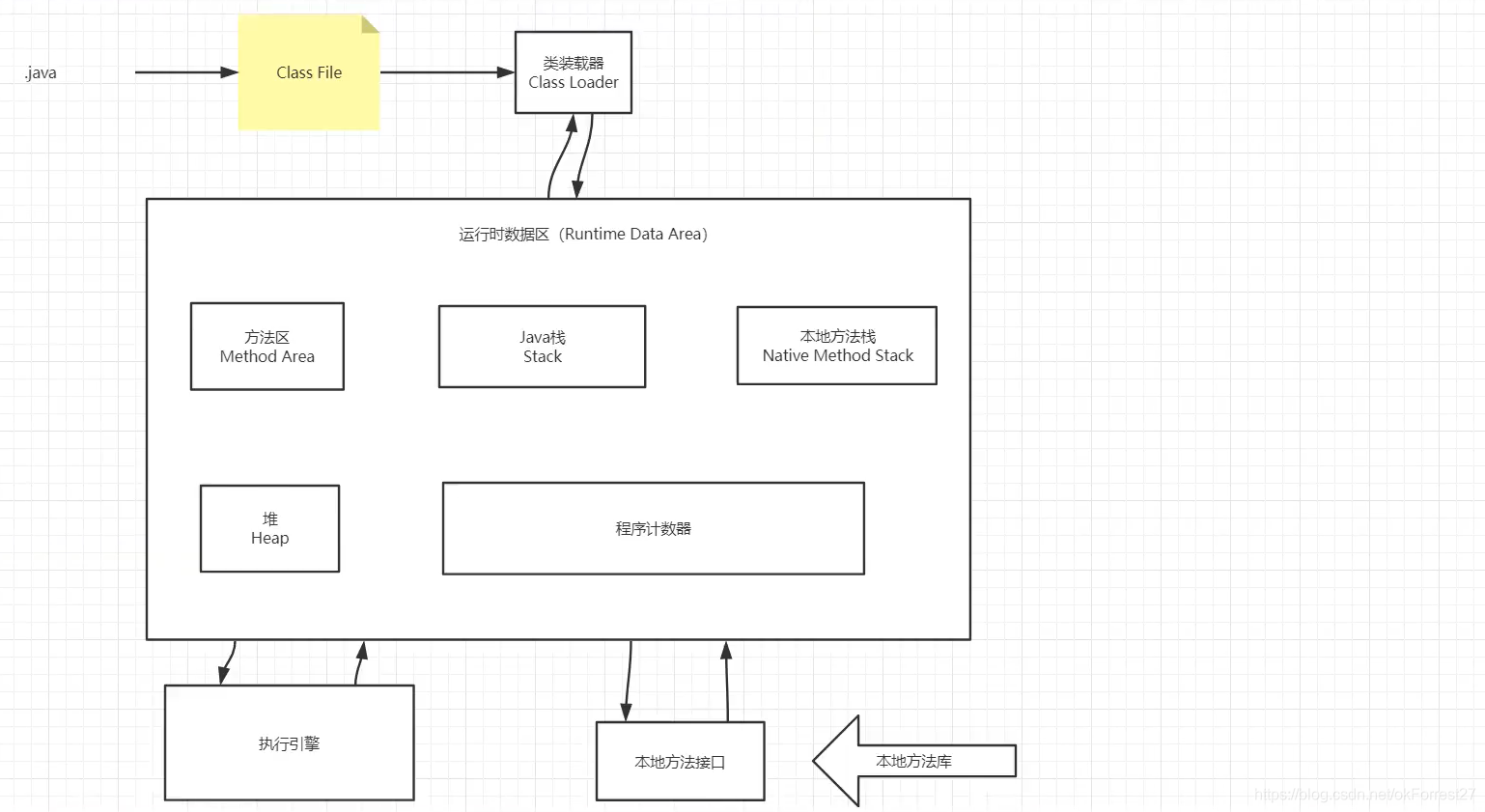 .java > Class File > 类装载器 Class Loader > 运行时数据区 Runtime Data Area > (... > 方法区、Java栈、本地方法栈、堆、程序计数器 > ...)> 执行引擎、本地方法接口、本地方法库