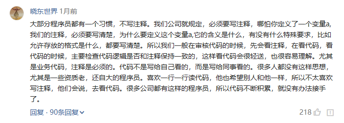 1.大部分程序员都有一个习惯,不写注释。我们公司就规定,必须要写注释,哪怕你定义了一个变量a,我们的注释,必须要写清楚,为什么要定义这个变量a,它的含义是什么,有没有什么特殊要求,比如允许存放的格式是什么,都要写清楚。所以我们一般在审核代码的时候,先会看注释,在看代码,看代码的时候,主要检查代码逻辑是否和注释保持一致的,这样看代码会很轻送,也很容易理解。尤其是业务代码,注释是必须的。代码不是写给自己看的,而是写给同事看的。很多人都没有这样思想,尤其是一些资质老,还自大的程序员。喜欢一行一行读代码,他也希望别人和他一样,所以不太喜欢写注释,他们会说,去看代码。很多公司都有这样的程序员,所以代码不断积累,就没有办法接手了。