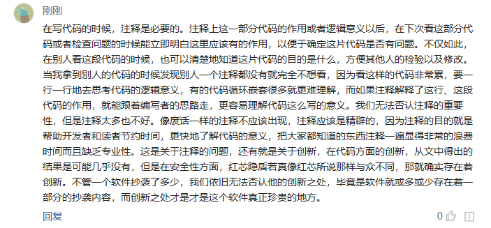 在写代码的时候,注释是必要的。注释上这一部分代码的作用或者逻辑意义以后,在下次看这部分代码或者检查问题的时候能立即明白这里应该有的作用,以便于确定这片代码是否有问题。不仅如此,在别人看这段代码的时候,也可以清楚地知道这片代码的目的是什么,方便其他人的检验以及修改。当我拿到别人的代码的时候发现别人一个注释都没有就完全不想看,因为看这样的代码非常累,要一行一行地去思考代码的逻辑意义,有的代码循环嵌套很多就更难理解,而如果注释解释了这行、这段代码的作用,就能跟着编写者的思路走,更容易理解代码这么写的意义。我们无法否认注释的重要性,但是注释太多也不好。像废话一样的注释不应该出现,注释应该是精辟的,因为注释的目的就是帮助开发者和读者节约时间,更快地了解代码的意义,把大家都知道的东西注释一遍显得非常的浪费时间而且缺乏专业性。这是关于注释的问题,还有就是关于创新,在代码方面的创新,从文中得出的结果是可能几乎没有,但是在安全性方面,红芯隐盾若真像红芯所说那样与众不同,那就确实存在着创新。不管一个软件抄袭了多少,我们依旧无法否认他的创新之处,毕竟是软件就或多或少存在着一部分的抄袭内容,而创新之处才是才是这个软件真正珍贵的地方。