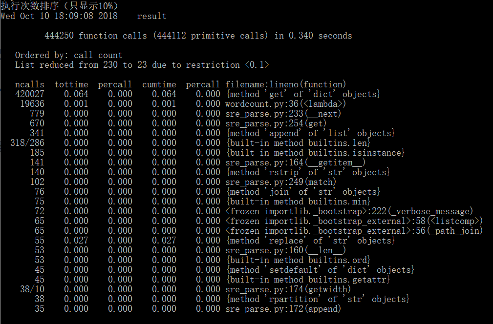 percall:(第二个percall)即函数运行一次的平均时间,等于 cumtime/ncalls;