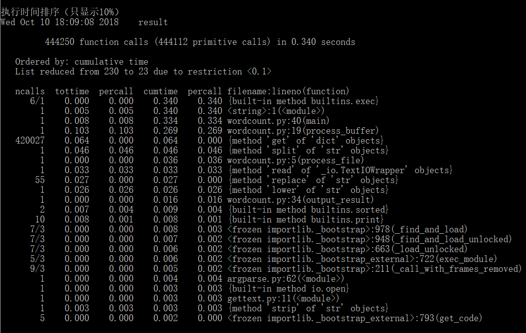 tottime:表示指定函数的总的运行时间,除掉函数中调用子函数的运行时间;