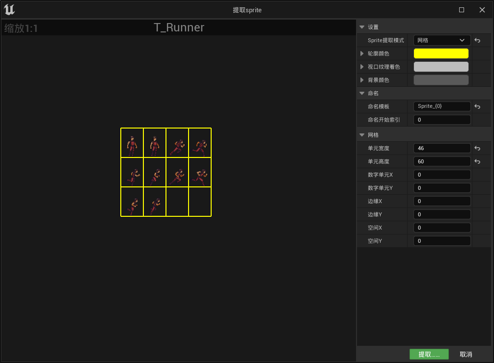 对Background和Goal文件夹中的素材,选中右键,创建他们的精灵形式。而对于Runner文件夹中的精灵表,右键选择提取精灵,设置选取参数后提取精灵