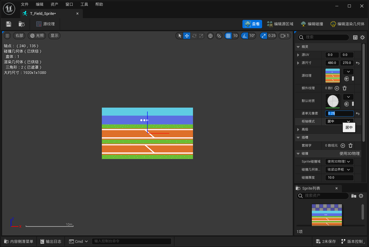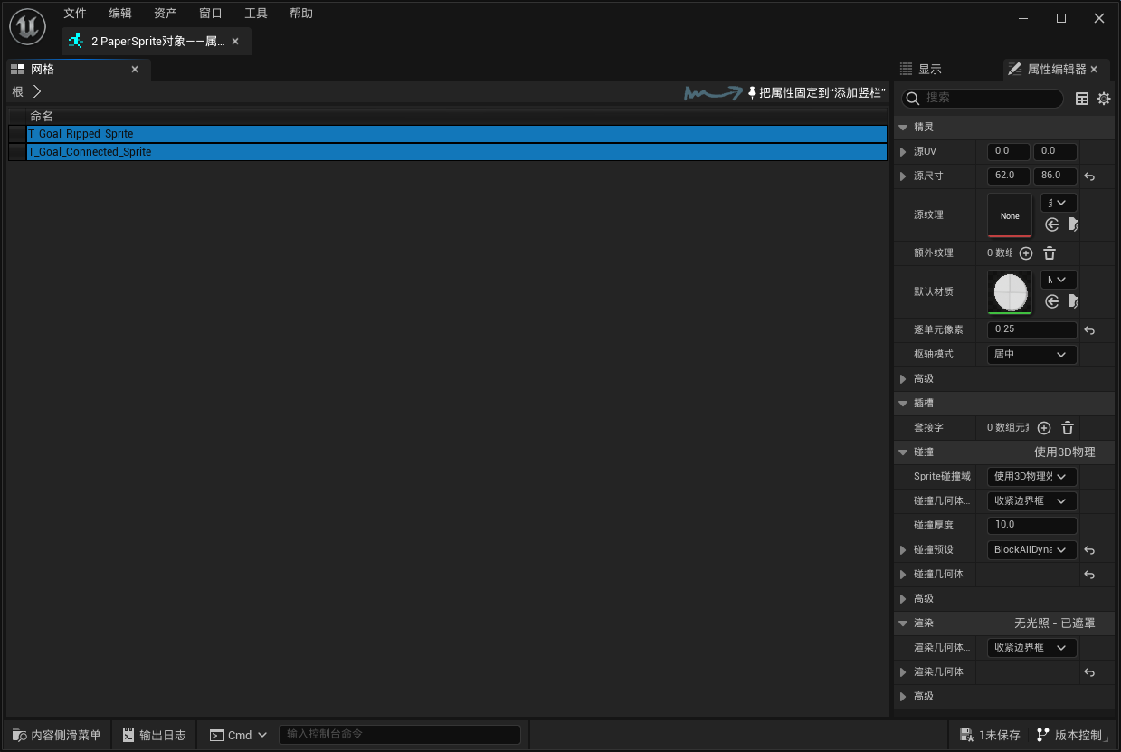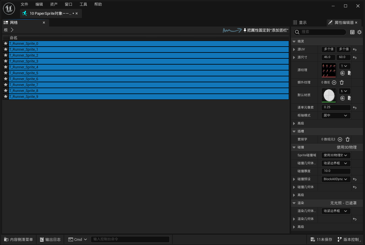 回到虚幻编辑器,到素材文件夹中,通过属性矩阵批量编辑,调整所有精灵的尺寸,调整逐单元像素为0.25
