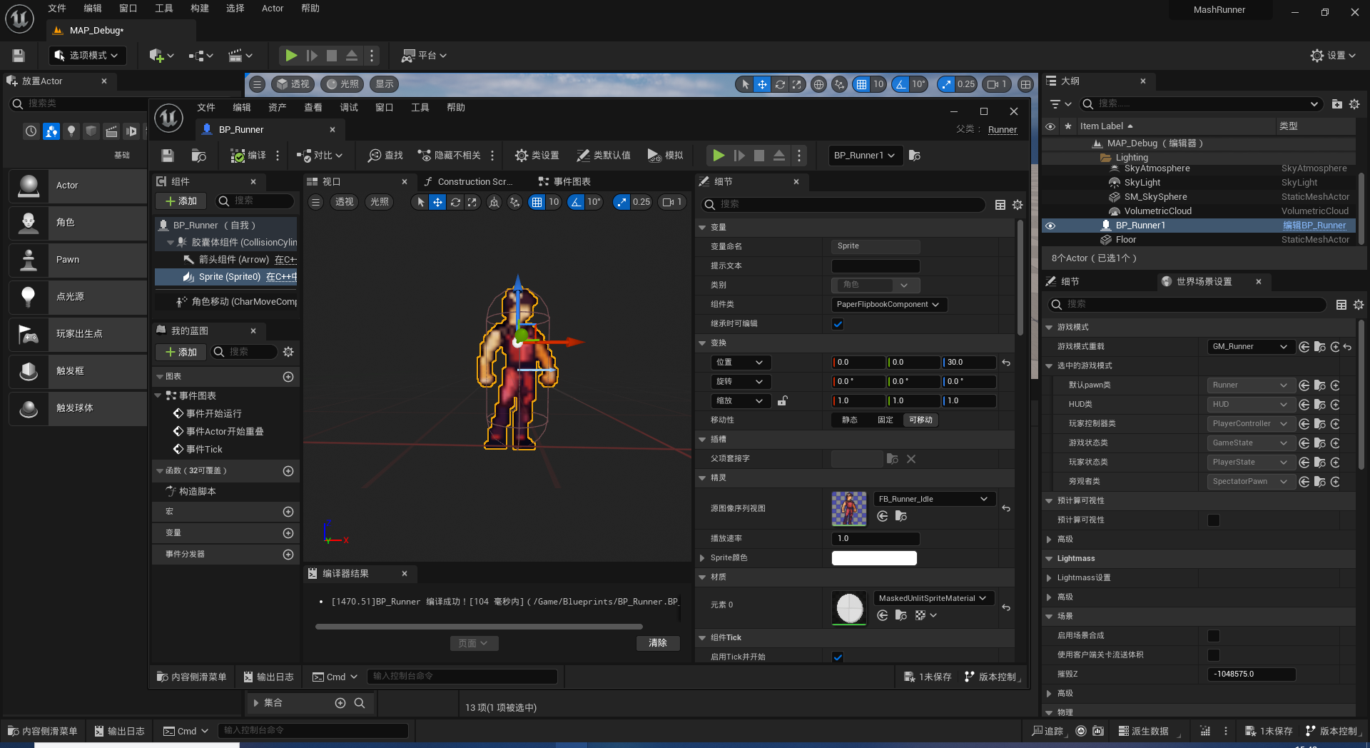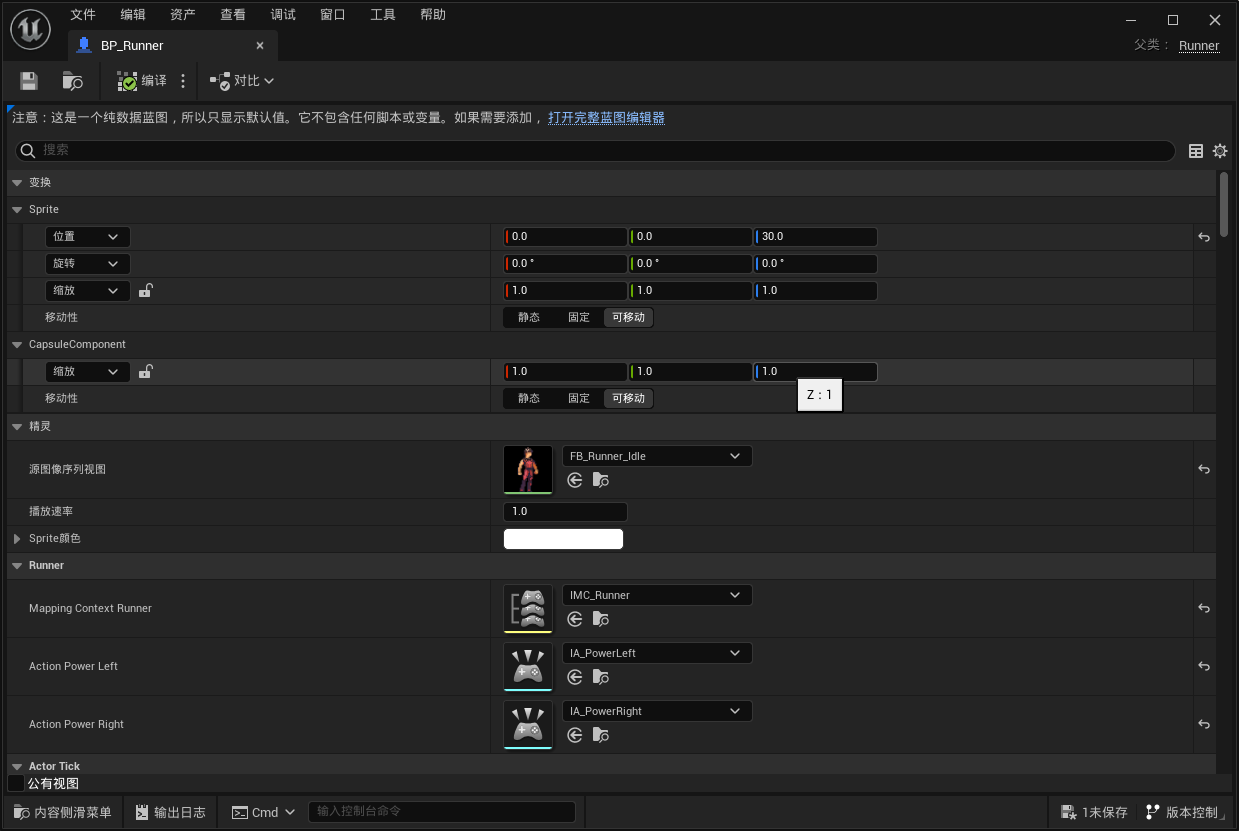 在内容浏览器的根目录创建一个Blueprints的文件,再在其中创建一个基于Runner类的蓝图类,命名为BP_Runner,然后编辑BP_Runner