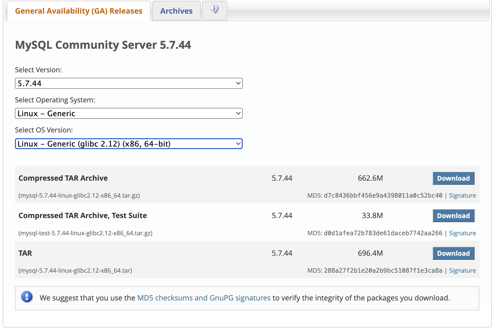 下载地址 https://dev.mysql.com/downloads/mysql/5.7.html