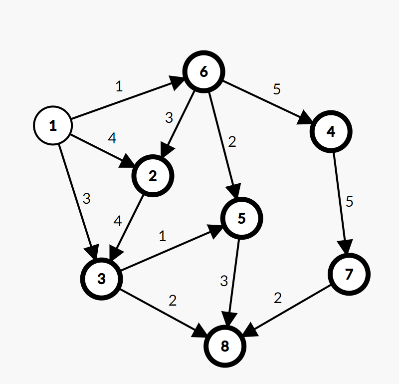 使用 \(Dijkstra\) 算法求解最短路问题时的某个状态,其中黑点表示仍在 \(Q\) 中。此时 \(1\) 号点已从 \(Q\) 中取出,接下来应取出 \(6\) 号点