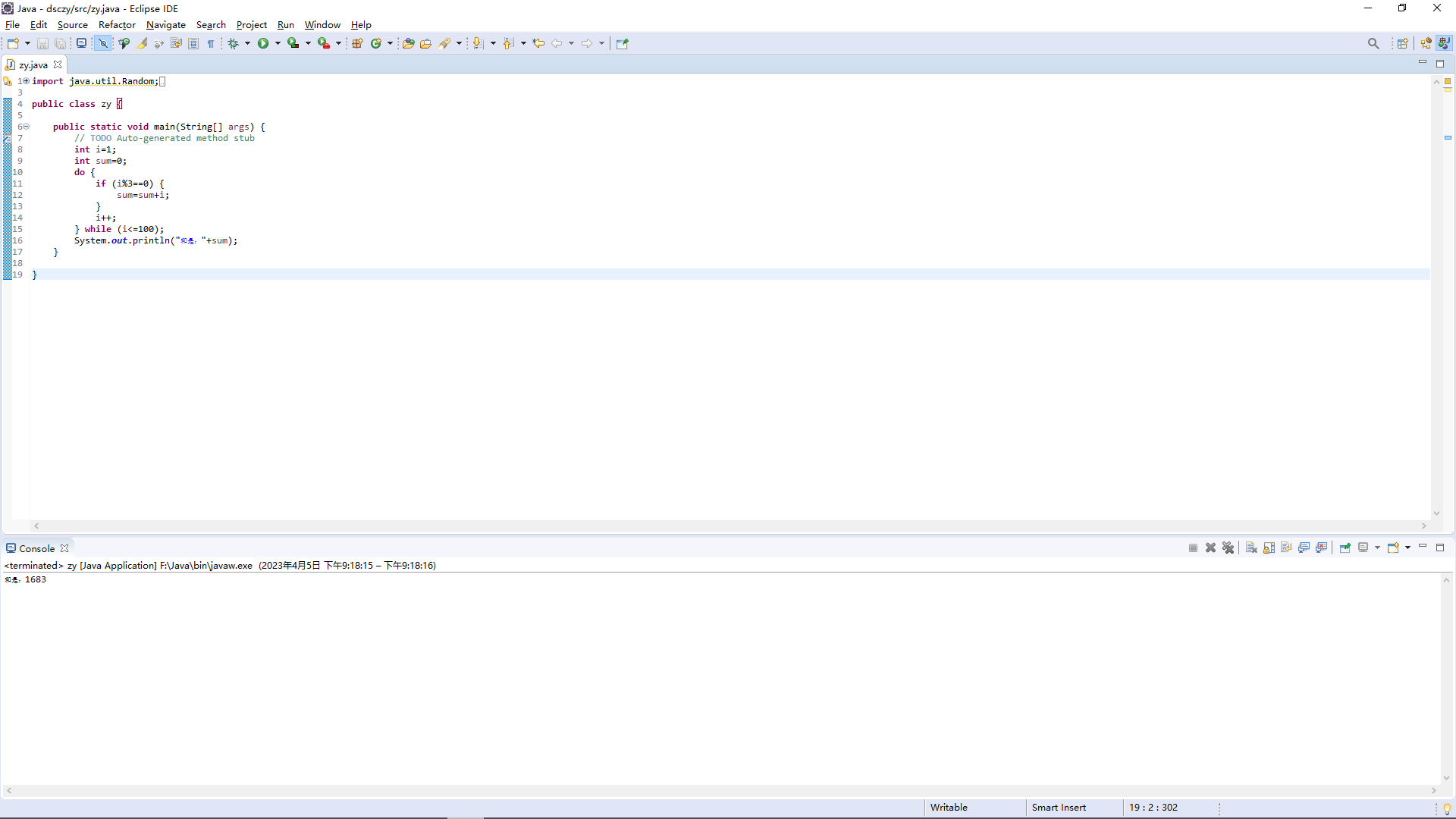 import java.util.Random; import java.util.Scanner; public class zy { public static void main(String[] args) { // TODO Auto-generated method stub int i=1; int sum=0; while (i<=100) { if (i%3==0) { sum=sum+i; } i++; } System.out.println("和是:"+sum); } }