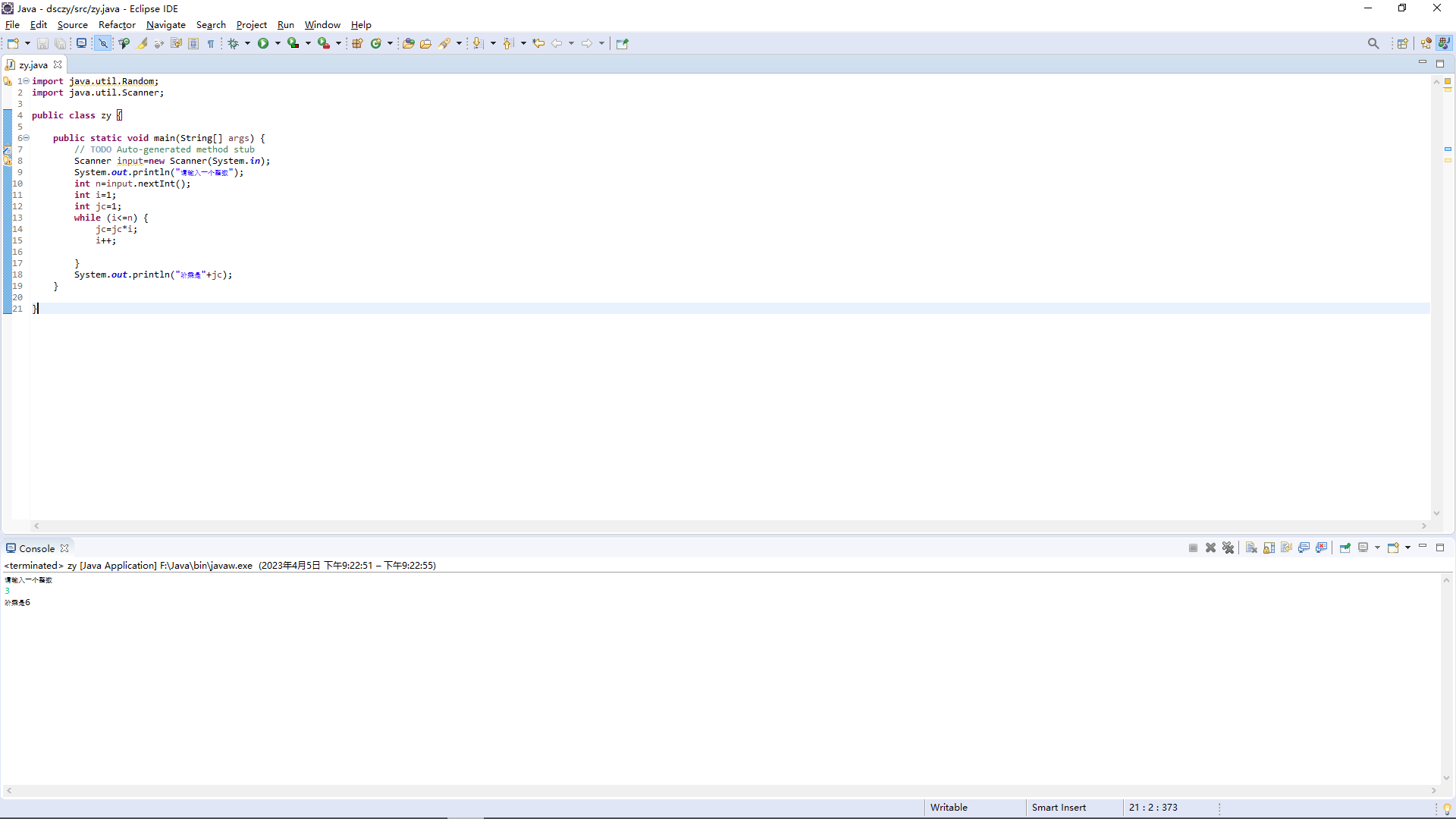 import java.util.Random; import java.util.Scanner; public class zy { public static void main(String[] args) { // TODO Auto-generated method stub Scanner input=new Scanner(System.in); System.out.println("请输入一个整数"); int n=input.nextInt(); int i=1; int jc=1; while (i<=n) { jc=jc*i; i++; } System.out.println("阶乘是"+jc); } }