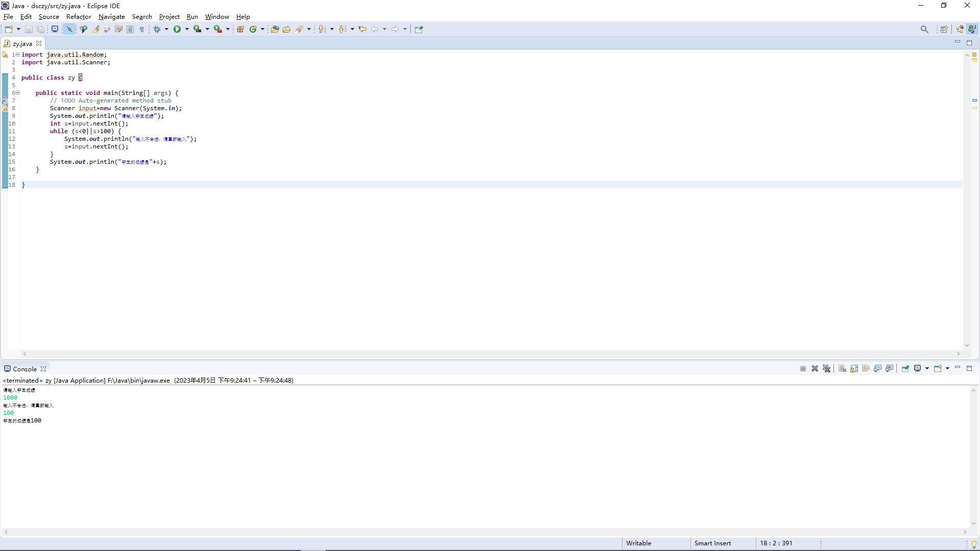 import java.util.Random; import java.util.Scanner; public class zy { public static void main(String[] args) { // TODO Auto-generated method stub Scanner input=new Scanner(System.in); System.out.println("请输入学生成绩"); int s=input.nextInt(); while (s<0||s>100) { System.out.println("输入不合法,请重新输入"); s=input.nextInt(); } System.out.println("学生的成绩是"+s); } }