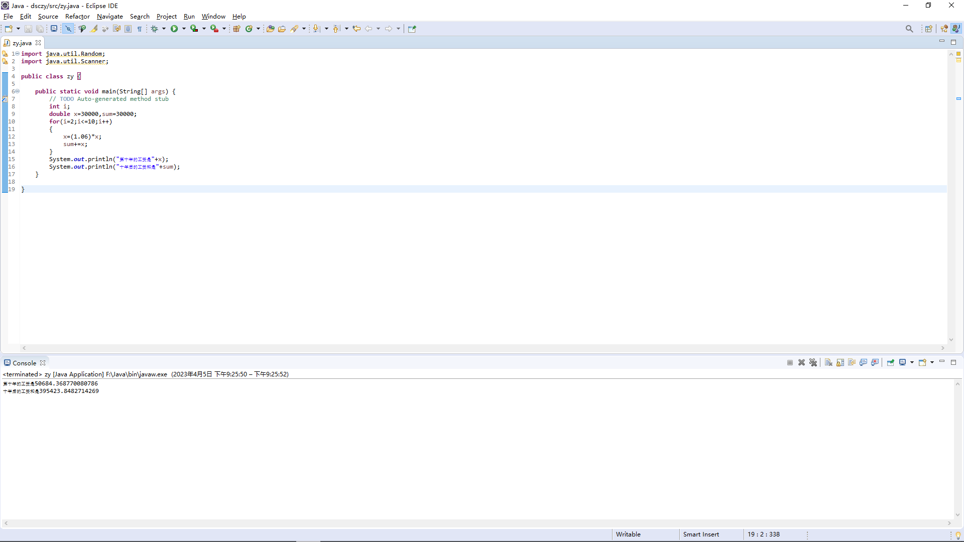 import java.util.Random; import java.util.Scanner; public class zy { public static void main(String[] args) { // TODO Auto-generated method stub int i; double x=30000,sum=30000; for(i=2;i<=10;i++) { x=(1.06)*x; sum+=x; } System.out.println("第十年的工资是"+x); System.out.println("十年后的工资和是"+sum); } }