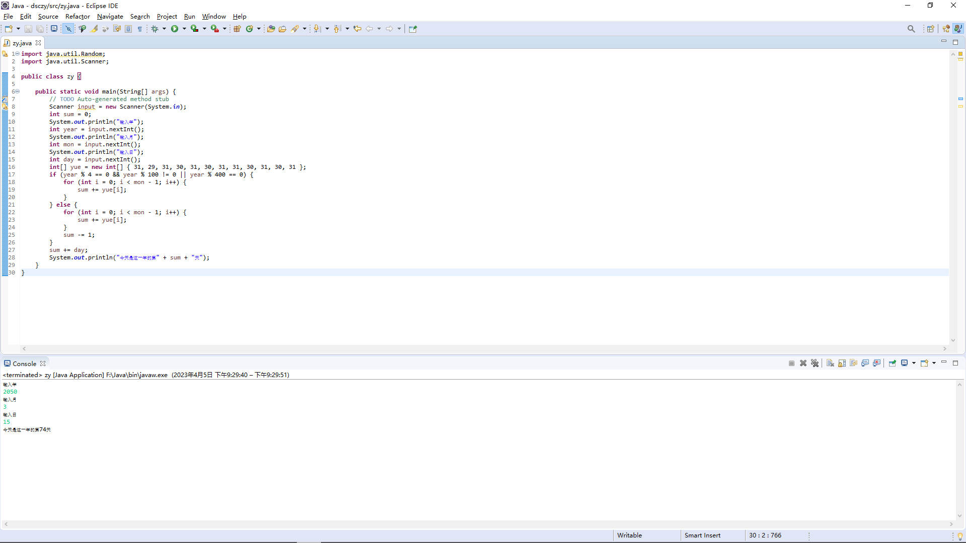 import java.util.Random; import java.util.Scanner; public class zy { public static void main(String[] args) { // TODO Auto-generated method stub Scanner input = new Scanner(System.in); int sum = 0; System.out.println("输入年"); int year = input.nextInt(); System.out.println("输入月"); int mon = input.nextInt(); System.out.println("输入日"); int day = input.nextInt(); int[] yue = new int[] { 31, 29, 31, 30, 31, 30, 31, 31, 30, 31, 30, 31 }; if (year % 4 == 0 && year % 100 != 0 || year % 400 == 0) { for (int i = 0; i < mon - 1; i++) { sum += yue[i]; } } else { for (int i = 0; i < mon - 1; i++) { sum += yue[i]; } sum -= 1; } sum += day; System.out.println("今天是这一年的第" + sum + "天"); } }