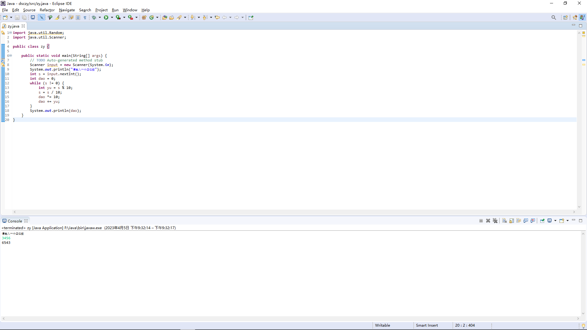 import java.util.Random; import java.util.Scanner; public class zy { public static void main(String[] args) { // TODO Auto-generated method stub Scanner input = new Scanner(System.in); System.out.println("请输入一个四位数"); int s = input.nextInt(); int dao = 0; while (s != 0) { int yu = s % 10; s = s / 10; dao *= 10; dao += yu; } System.out.println(dao); } }