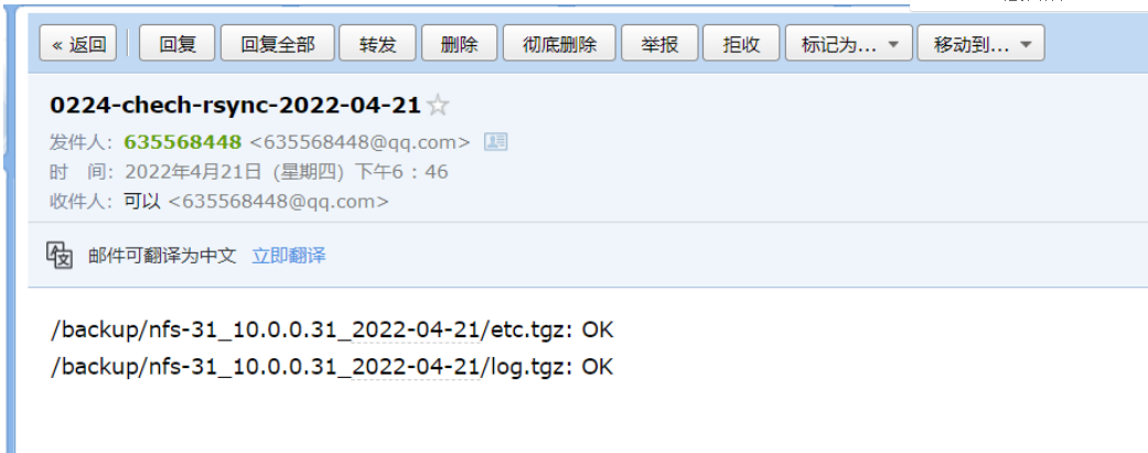 [root@rsync-41 ~]#mail -s "0224-chech-rsync-$(date +%F)" 635568448@qq.com < /backup/nfs-31_10.0.0.31_2022-04-21/chech_md5_result.txt