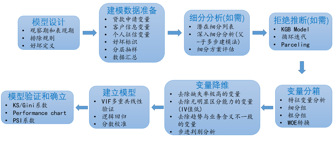 申请客群→拒绝黑名单与欺诈客户(F卡)→拒绝高信用风险客户+审批通过(A卡 信用评分卡的目标客群)