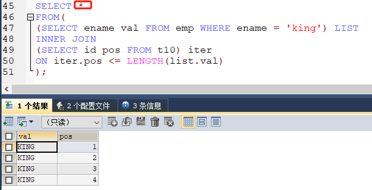 SELECT SUBSTR(list.val,iter.pos,1) c FROM( (SELECT ename val FROM emp WHERE ename = 'king') list INNER JOIN (SELECT id pos FROM t10) iter ON iter.pos <= LENGTH(list.val) );