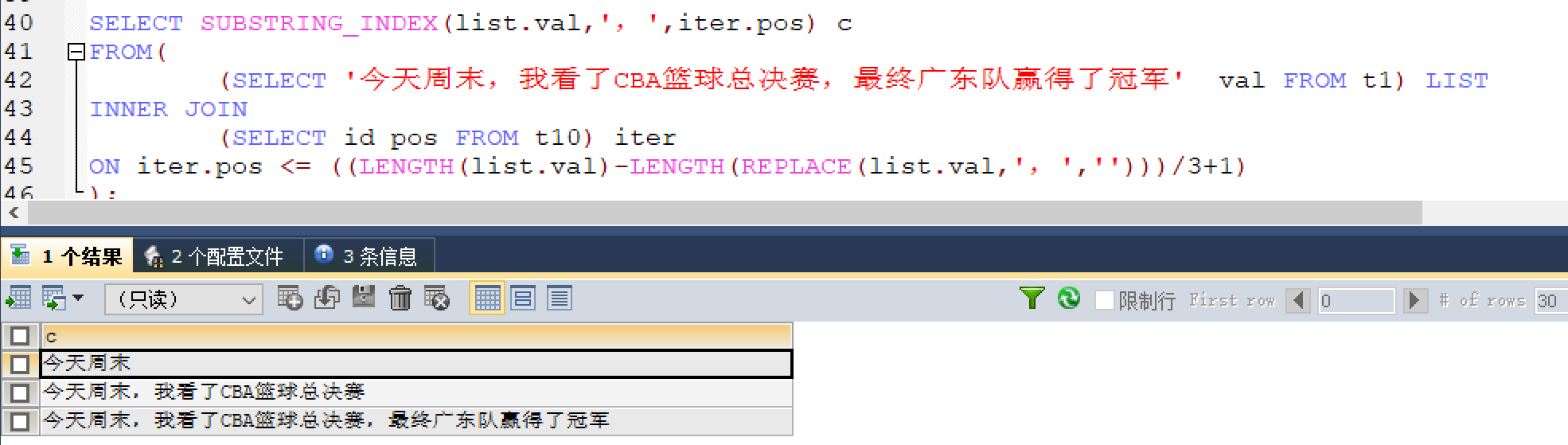 1 SELECT SUBSTRING_INDEX(SUBSTRING_INDEX(list.val,',',iter.pos),',',-1) c 2 FROM( 3 (SELECT '今天周末,我看了CBA篮球总决赛,最终广东队赢得了冠军' val FROM t1) LIST 4 INNER JOIN 5 (SELECT id pos FROM t10) iter 6 ON iter.pos <= ((LENGTH(list.val)-LENGTH(REPLACE(list.val,',','')))/3+1) #此处除以三是因为汉字占3个字节 7 );