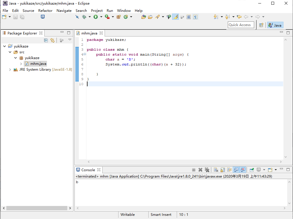 package yukikaze; public class mhm { public static void main(String[] args) { char a = 'B'; System.out.println((char)(a + 32)); } }