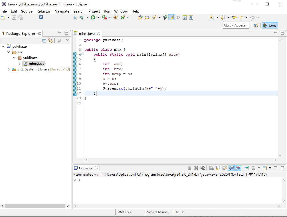 package yukikaze; public class mhm { public static void main(String[] args) { int a=1; int b=2; int temp = a; a = b; b=temp; System.out.println(a+" "+b); } }