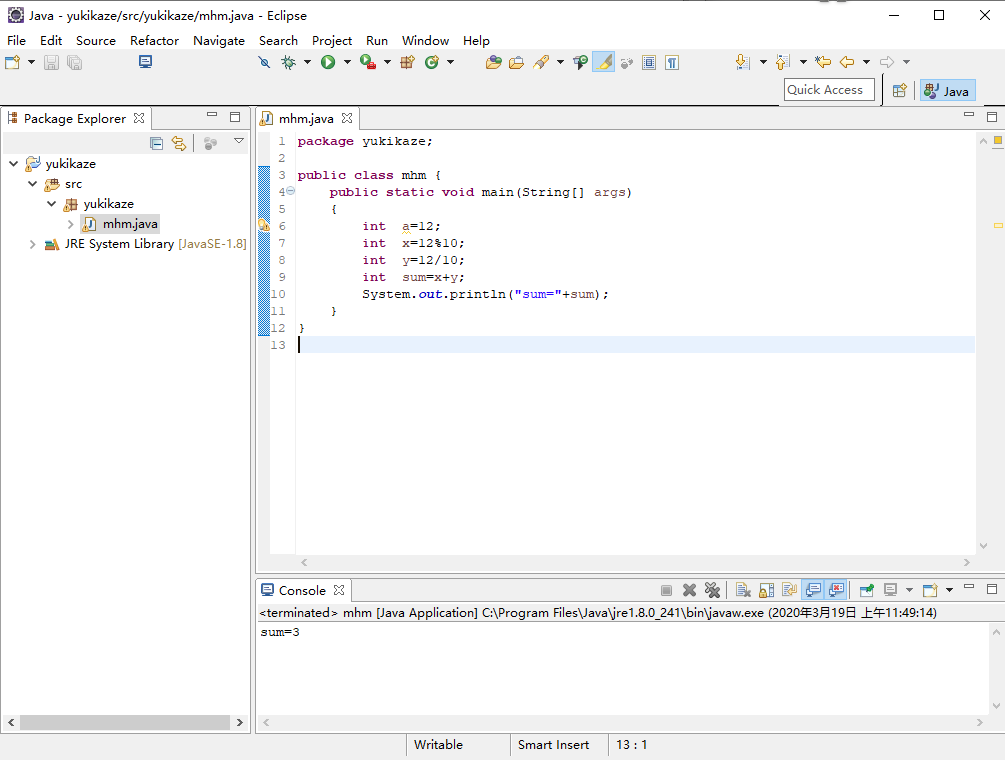 package yukikaze; public class mhm { public static void main(String[] args) { int a=12; int x=12%10; int y=12/10; int sum=x+y; System.out.println("sum="+sum); } }