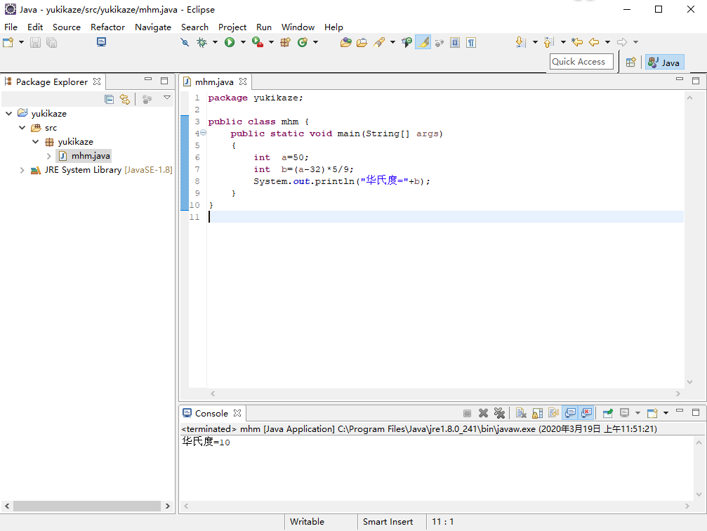 package yukikaze; public class mhm { public static void main(String[] args) { int a=50; int b=(a-32)*5/9; System.out.println("华氏度="+b); } }