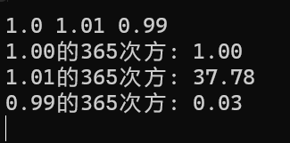 #include <stdio.h> #include <math.h> int main() { double x, ans; while(scanf("%lf", &x) != EOF) { ans = pow(x, 365); printf("%.2f的365次方: %.2f\n", x, ans); } return 0; }