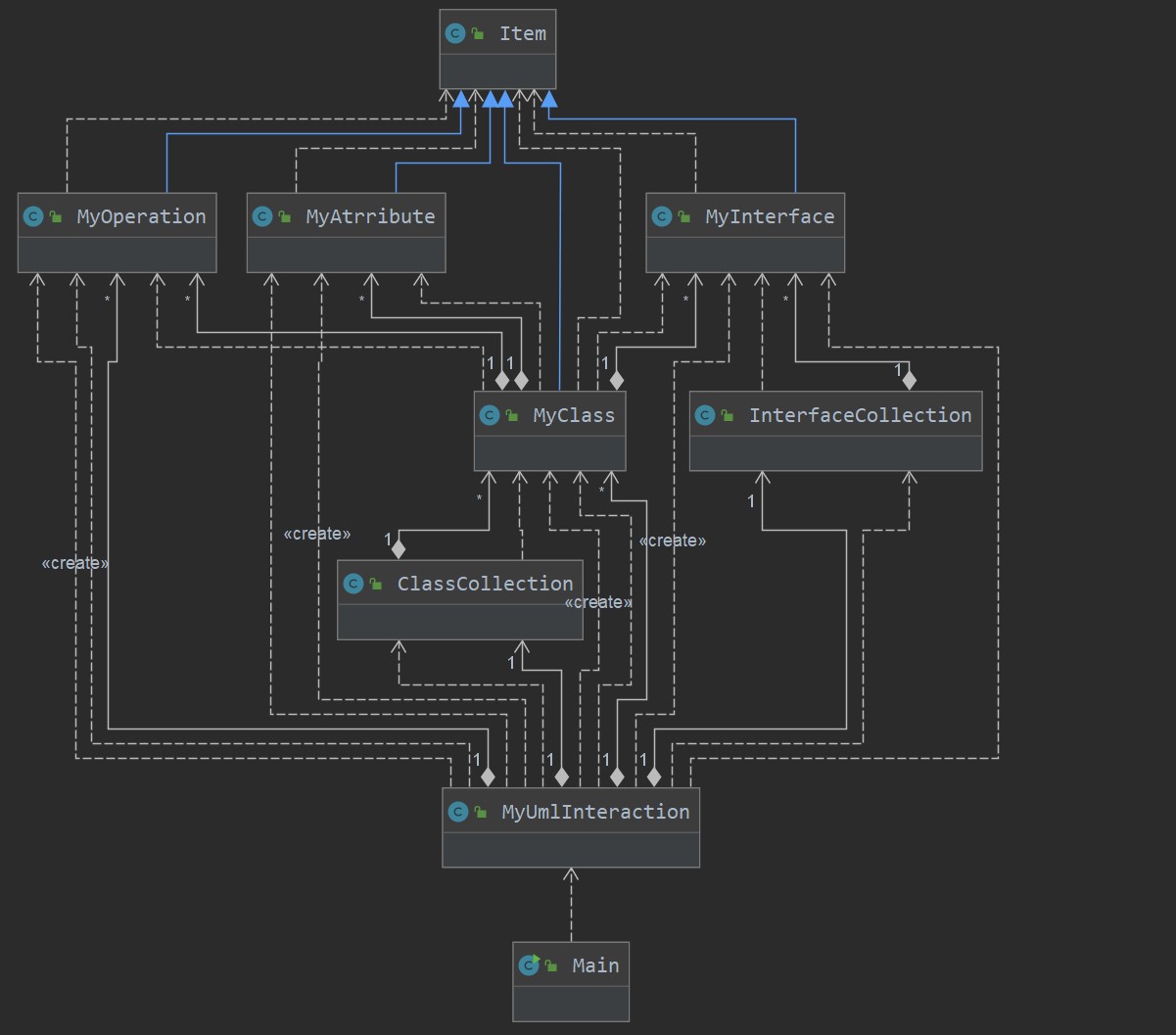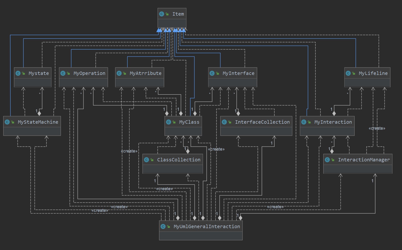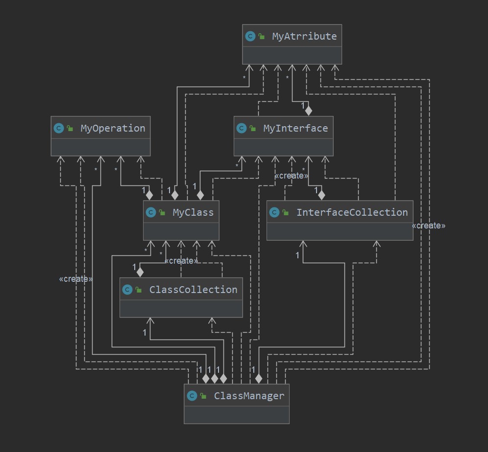 第一次作业一开始,我自己把需要的部分元素实现了一遍,例如MyClass,MyInterface等,他们分别存储了相对应的UML
