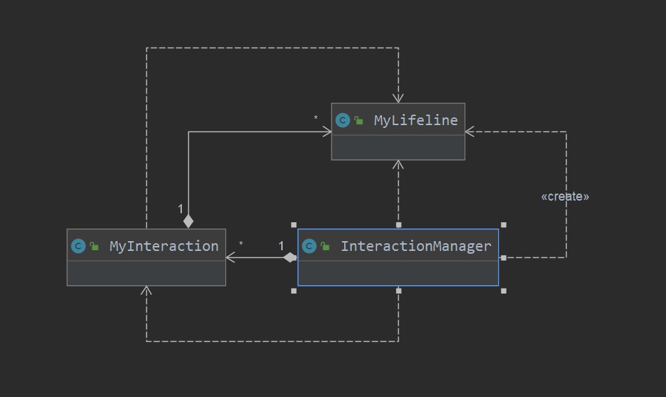 第二次作业的内容其实很简单,我还是依照上次按结构重新实现一遍这些类,如MyStateMachine,MyState,MyLifeline等。同时,上次代码的复用困难和眼看就要超500行了的限制,让我向上又封装了一层,StateManager和InteractionManger,把对于具体对象生成和查询处理的主要内容都放在了这个类里,对外只提供接收UmlElement和返回查询结果的接口,使得MyGeneralInteraction进一步解耦,具体实现也更清晰,更漂亮了。