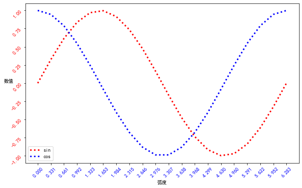 import numpy as np import matplotlib.pyplot as plt #设定画布大小 fig = plt.figure(figsize=(10,6)) colors = ['red', 'blue'] x = np.linspace(0,2*np.pi,20) y = [np.sin(x),np.cos(x)] labels = ['sin','cos'] for i in range(2): plt.plot(x, y[i], c=colors[i], label=labels[i],linewidth=3.0,linestyle=':') #设置坐标属性,显示的刻度、颜色、坐标显示倾斜角度 plt.xticks(x,color='blue',rotation=45) plt.yticks(color='red',rotation=45) #设置坐标轴名称 plt.xlabel('弧度') plt.ylabel('数值',rotation=0) #显示标签位置,print help(plt.legend)可以查看有哪些位置可以放 plt.legend(loc='best') plt.show()
